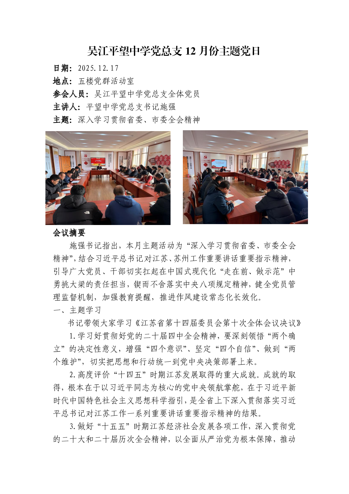 吴江平望中学党总支12月份主题党日活动